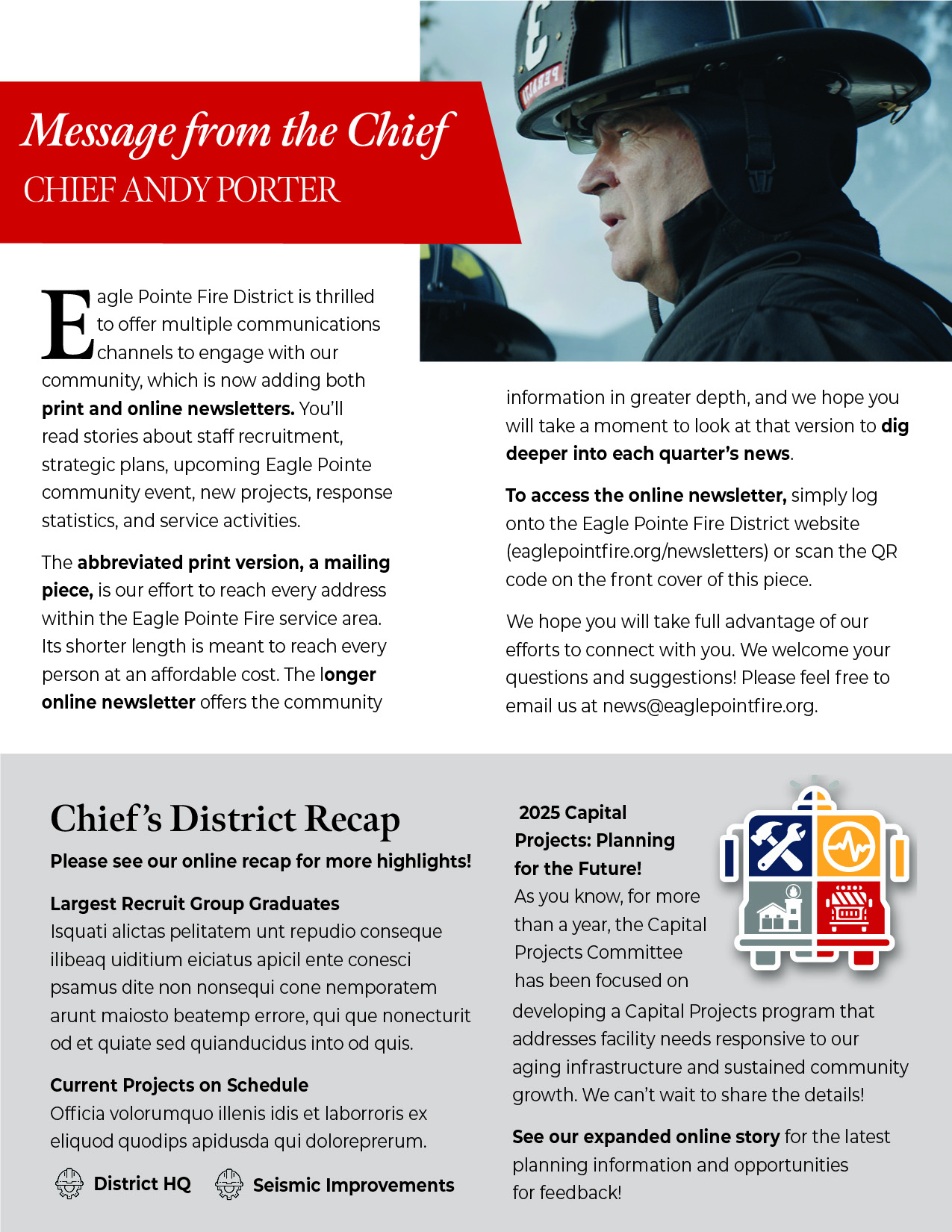 One-page newsletters can be letter size, legal, or tabloid size, designed to meet post office standards. Below are printed, website, and animated online samples.